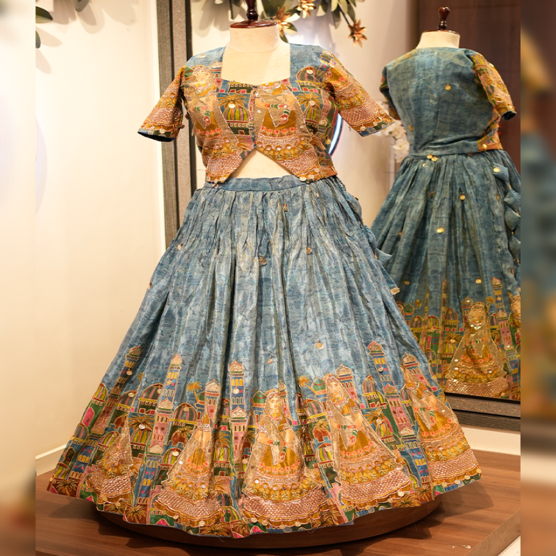 A premium embroidered lehenga set with intricate detailing, heavy craftsmanship, and a beautifully flared silhouette—ideal for weddings and festive events.