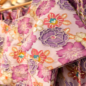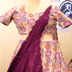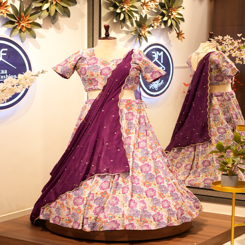 This Floral Printed Lehenga Set features a vibrant blend of pastel florals paired with a rich purple dupatta. Crafted from soft, lightweight fabric, the lehenga offers a breezy flow and a festive charm. The matching floral blouse is designed with a modern cut and detailed patterning, making this ensemble perfect for haldi, mehndi, parties, and festive celebrations.