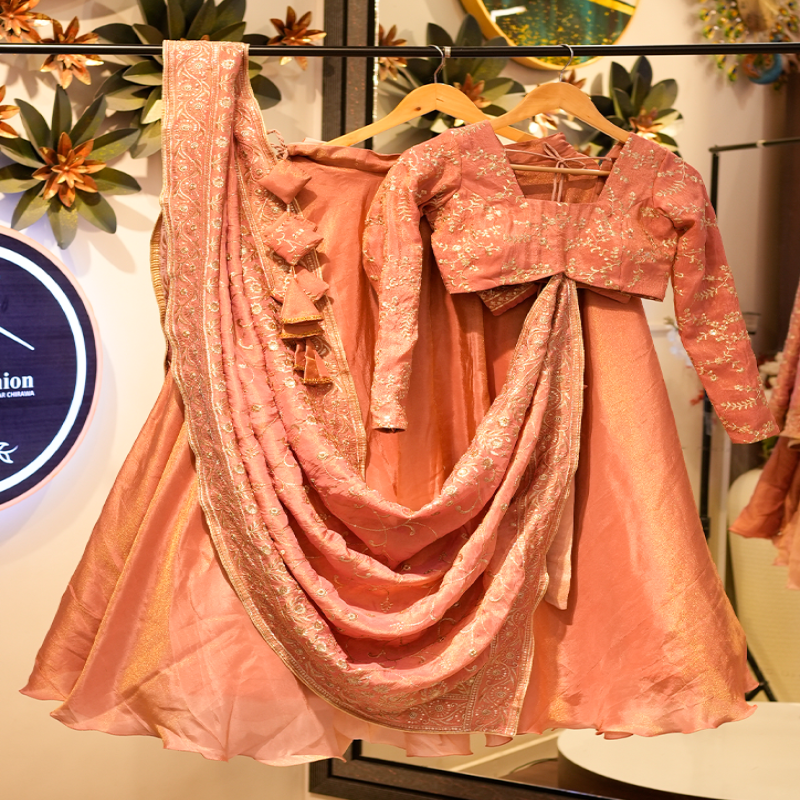 A premium peach-pink lehenga set with rich golden embroidery, tassel-detailed dupatta, and a beautifully crafted blouse — perfect for weddings and festive functions.