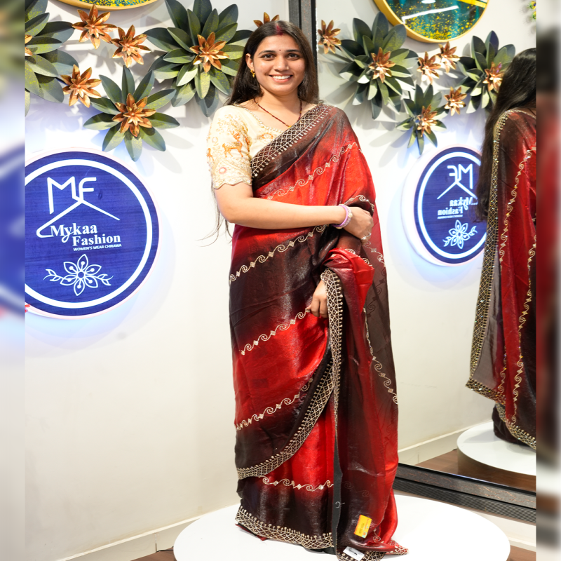 This stunning Maroon color Saree is designed to give a rich and elegant look, perfect for special occasions and festive wear. The saree is beautifully adorned with intricate Cut Dana work, which adds sparkle and enhances its overall charm.
