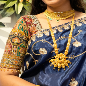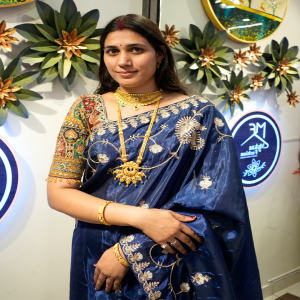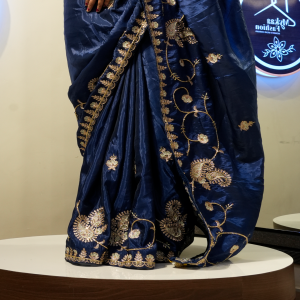 The deep navy shade gives a graceful and royal appeal, making it ideal for weddings, festive celebrations, parties, and special occasions. The saree drapes beautifully and enhances your overall look with its classic charm and detailed embellishment. A must-have addition to your ethnic wardrobe for a refined and stylish appearance.