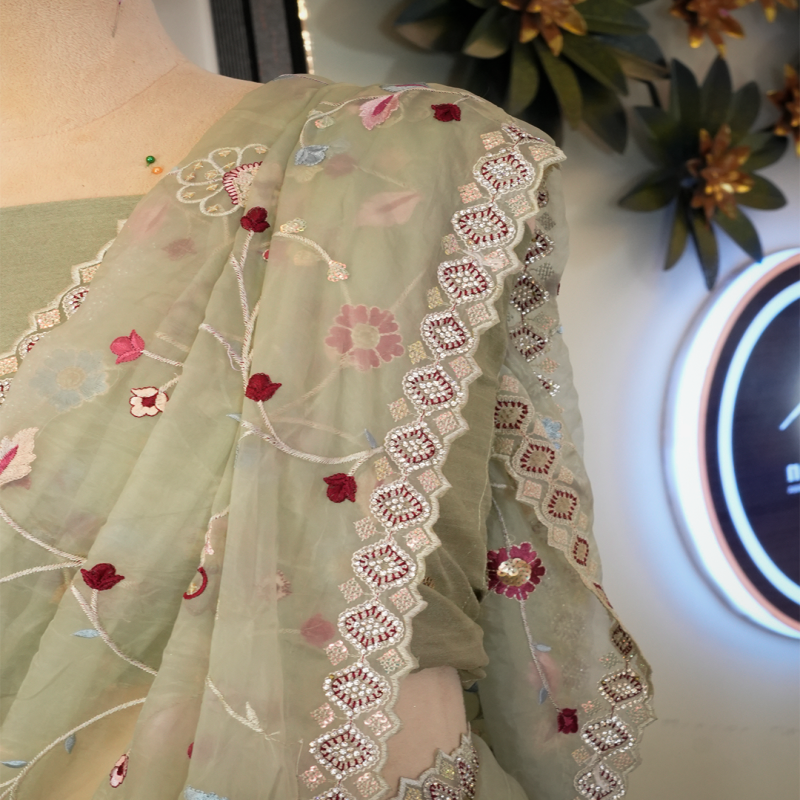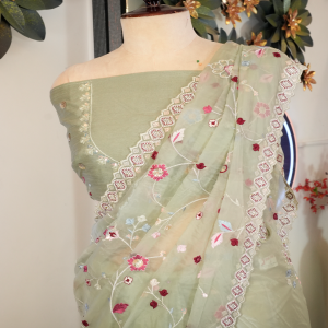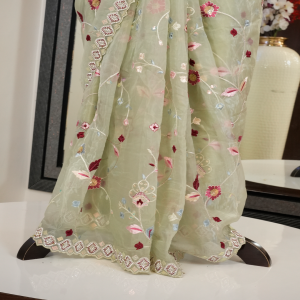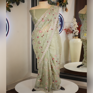 This elegant saree comes in a beautiful sea green color, giving it a fresh and graceful look. It is adorned with intricate paper glass and resham work, which adds a subtle shine and rich detailing to the saree. The craftsmanship enhances its overall charm, making it suitable for festive occasions, weddings, and special events. The saree is designed to offer both comfort and a stylish appearance.
