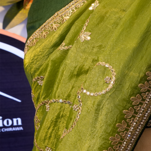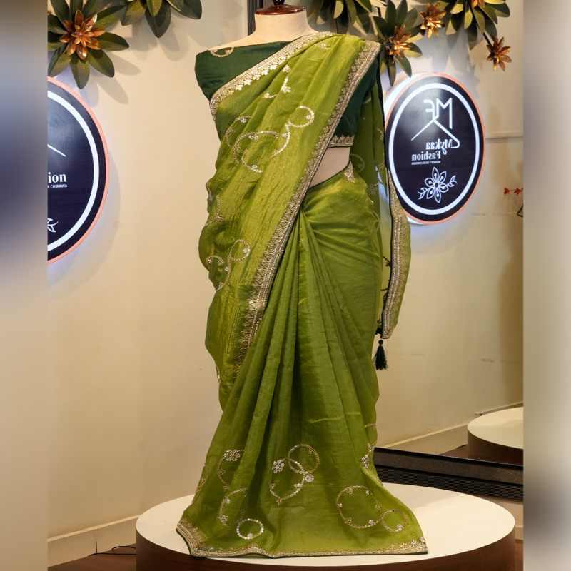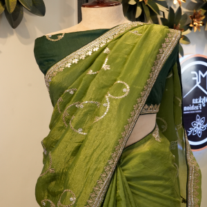 Elevate your ethnic wardrobe with this elegant green royal silk saree, crafted to reflect timeless grace and luxury. The saree features exquisite gotta patti work, adding a rich traditional touch with subtle shimmer. Made from premium royal silk fabric, it offers a smooth texture, graceful drape, and a regal finish—perfect for weddings, festive occasions, and special celebrations. This saree effortlessly blends classic craftsmanship with royal charm.