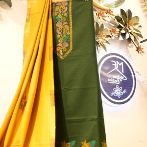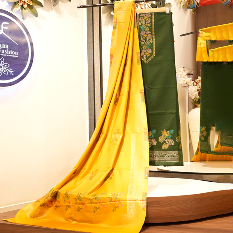 This Unstitched Mustard & Green Suit Fabric Set features a beautifully woven mustard dupatta paired with an intricately patterned green fabric. Perfect for festive wear, casual outings, or custom tailoring, this set offers rich texture, vibrant tones, and a premium handcrafted feel.