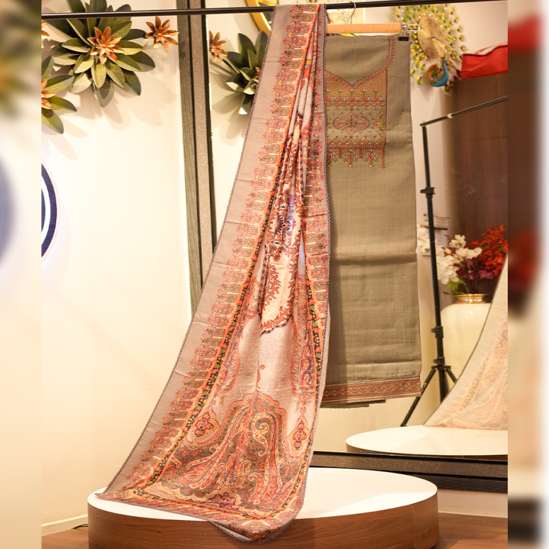 A premium unstitched suit fabric set ideal for tailoring custom-fit ethnic wear with rich color, soft texture, and versatile styling options.