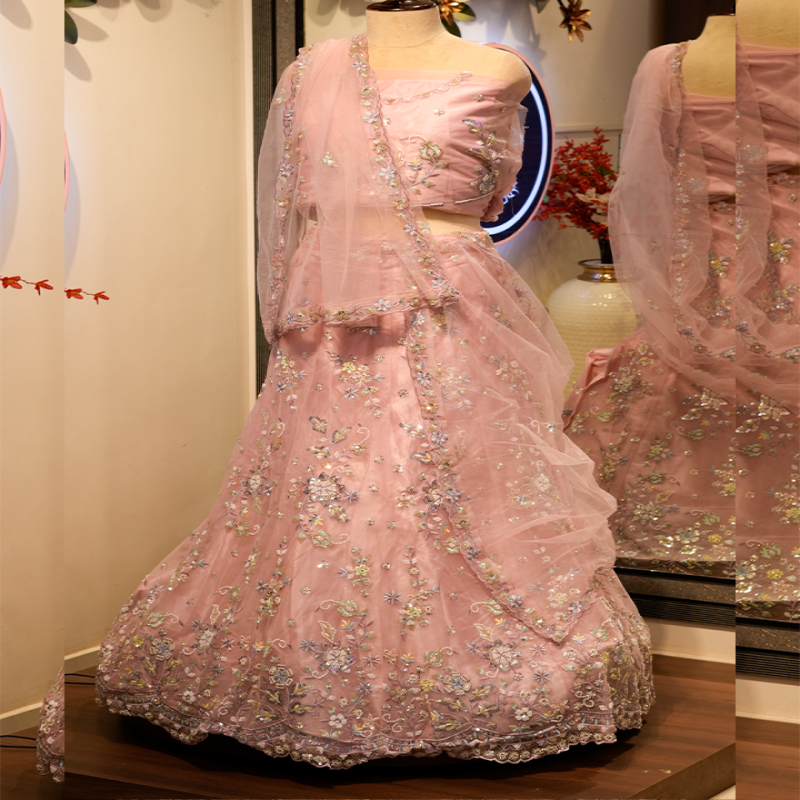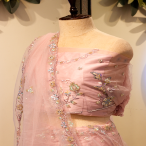 This lehenga is a delicate vision in soft pastel pink, radiating elegance and youthful charm. The sheer, lightweight fabric gives the outfit an airy, romantic feel, while the subtle shimmer throughout adds a graceful glow. The skirt is adorned with intricate floral embroidery, crafted with fine silver and pastel threadwork that creates a garden-like effect across the fabric. Small sequins and beads are scattered throughout, catching the light with every movement and giving the lehenga a gentle sparkle.