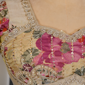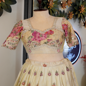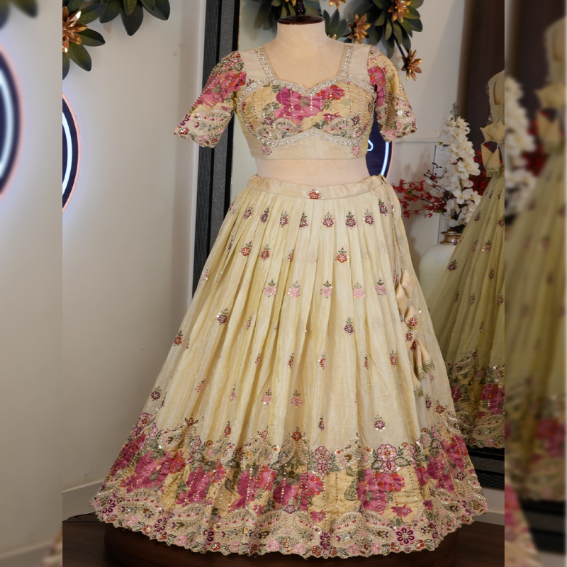 The lehenga displayed features a soft cream or pastel beige base with pink floral embroidery throughout. The blouse has short sleeves and is richly decorated with floral motifs and beaded details, giving it a delicate feminine look.