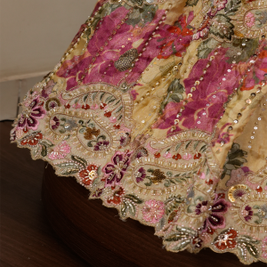 The skirt flows with pleated panels and small scattered floral motifs, while the hemline is elaborately embroidered with layered pink floral designs and borders, adding depth and elegance.