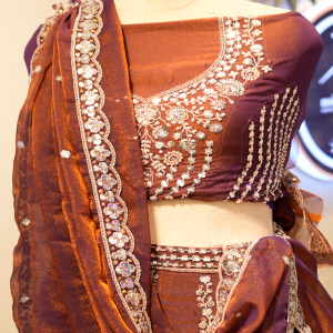 The blouse is beautifully coordinated, crafted in the same rich rust shade with dense white and silver embroidery that creates a visually captivating contrast. Its intricate patterns mirror the lehenga’s motifs, tying the ensemble together with harmony and elegance.