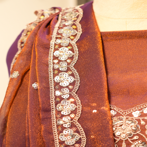 The dupatta completes the outfit with a regal touch. Draped gracefully, it carries matching embroidery along the borders and scattered embellishments throughout. The rust tone of the dupatta blends seamlessly with the outfit, enhancing the overall richness and festive appeal.