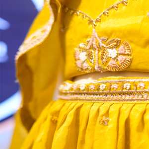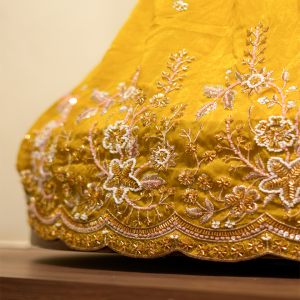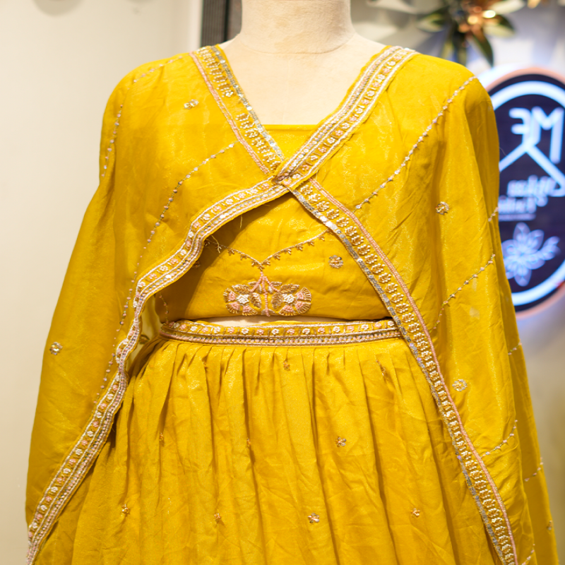 Small, scattered embellishments—tiny beads and sequins—are placed gracefully throughout the fabric, adding subtle sparkle without overwhelming the rich mustard tone. The waistline is highlighted with an embroidered belt-like detail, centered with a charming floral motif that brings a touch of traditional artistry to the ensemble.