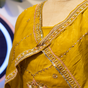 This outfit is a radiant mustard-yellow Anarkali-style ensemble that beautifully blends simplicity with elegance. The fabric has a soft, natural sheen, giving the outfit a warm and festive glow. The neckline features a unique crossover design, outlined with delicate embroidered borders in shades of gold and pastel pink. This intricate edging adds a refined touch, enhancing the overall sophistication of the garment.
