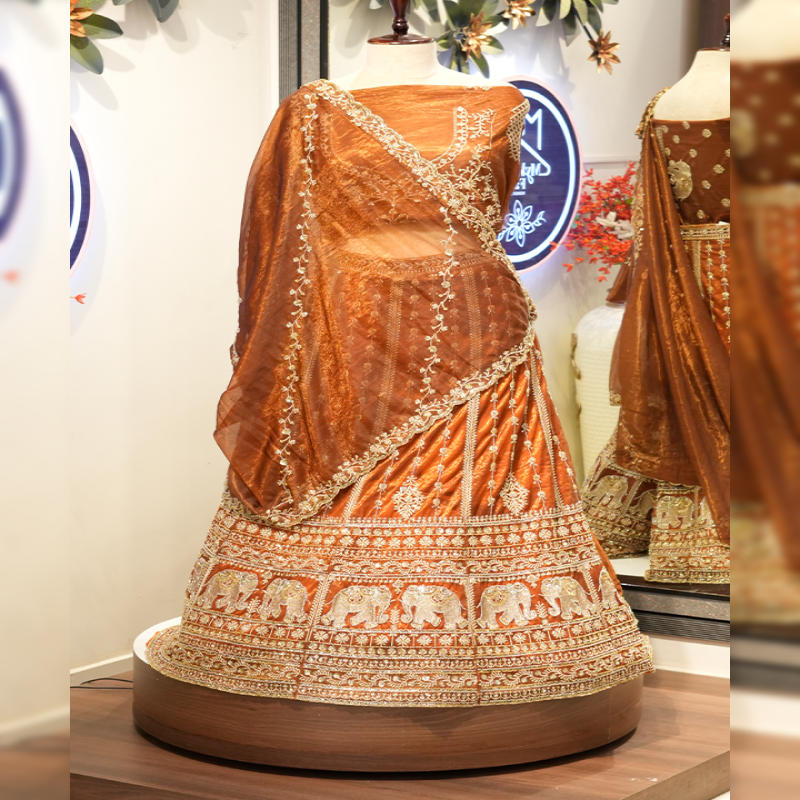 This lehenga is a stunning masterpiece in warm shades of rust orange and gold, radiating a rich, traditional charm. The skirt features exquisitely detailed embroidery with intricate motifs, including elegant floral patterns and a prominent row of beautifully crafted elephant designs along the lower border. These traditional elephant motifs symbolize grandeur and festivity, making the lehenga perfect for celebratory occasions.