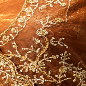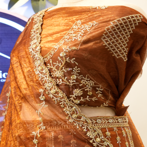 The dupatta is crafted from a lightweight, translucent fabric in a matching rust-orange shade. It is adorned with delicate embroidery along the borders and scattered embellishments across the body, adding sparkle without overwhelming the look. Draped gracefully, it complements the richness of the lehenga while bringing softness to the overall ensemble.