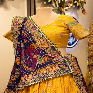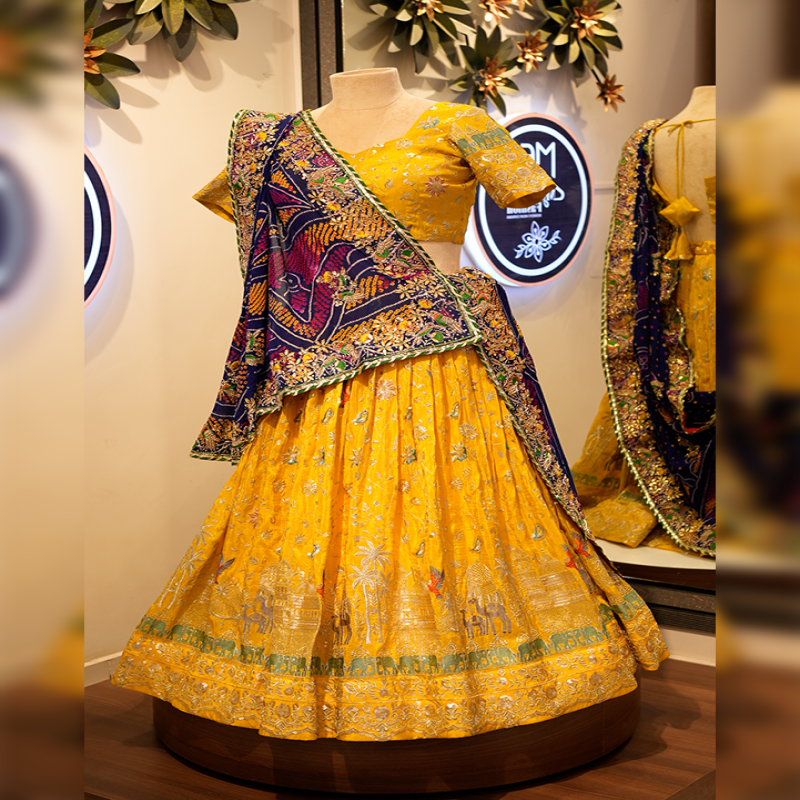 Shop this stunning Yellow Lehenga Choli for Women with intricate embroidery and a contrasting blue dupatta. Ideal for weddings, festive events, and traditional functions. Premium quality with a luxurious finish.