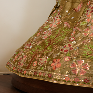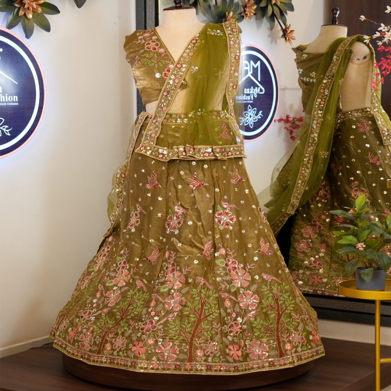 This is a traditional Indian lehenga in an earthy olive green tone with beautiful pink floral embroidery. The blouse has mirror work accents, and the lehenga skirt features dense floral motifs near the bottom, forming a garden-like pattern with trees and blossoms.
