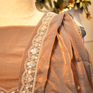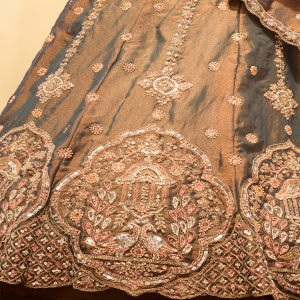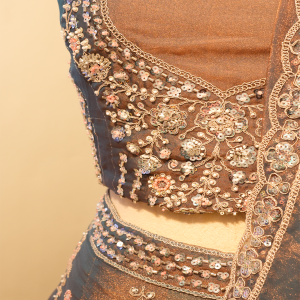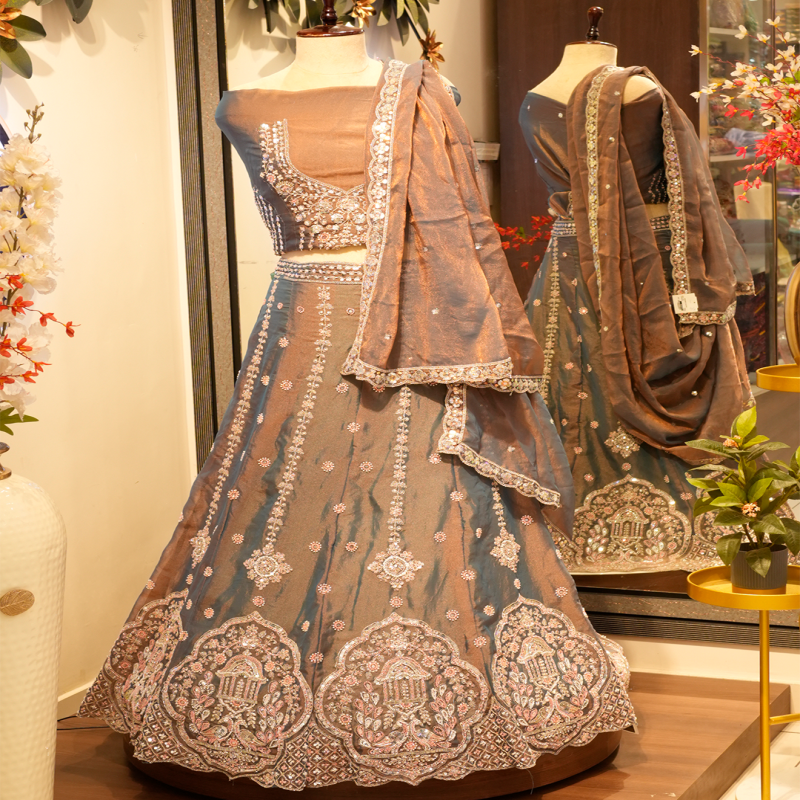 The outfit displayed is a traditional Indian lehenga in a soft brownish-nude tone with white and silver embroidery work.