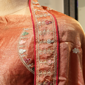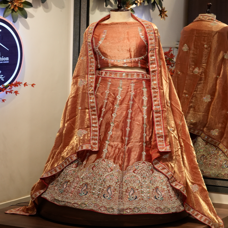 This lehenga is a rich and regal creation in a beautiful shade of copper-peach, radiating warmth and luxury. The fabric has a lustrous sheen that catches light beautifully, giving the entire ensemble an opulent glow. The skirt is adorned with intricate embroidery featuring floral and paisley motifs in pastel tones, silver threads, and delicate sequins. The lower border is especially detailed, showcasing layered patterns that add depth, grandeur, and artistic finesse.