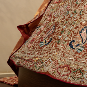 The dupatta completes the ensemble with its soft, flowing texture and matching embroidered borders. Subtle embellishments are scattered across the fabric, adding a gentle sparkle without overwhelming the rich tone of the outfit. Draped gracefully over the shoulders, it enhances the overall regal look.
