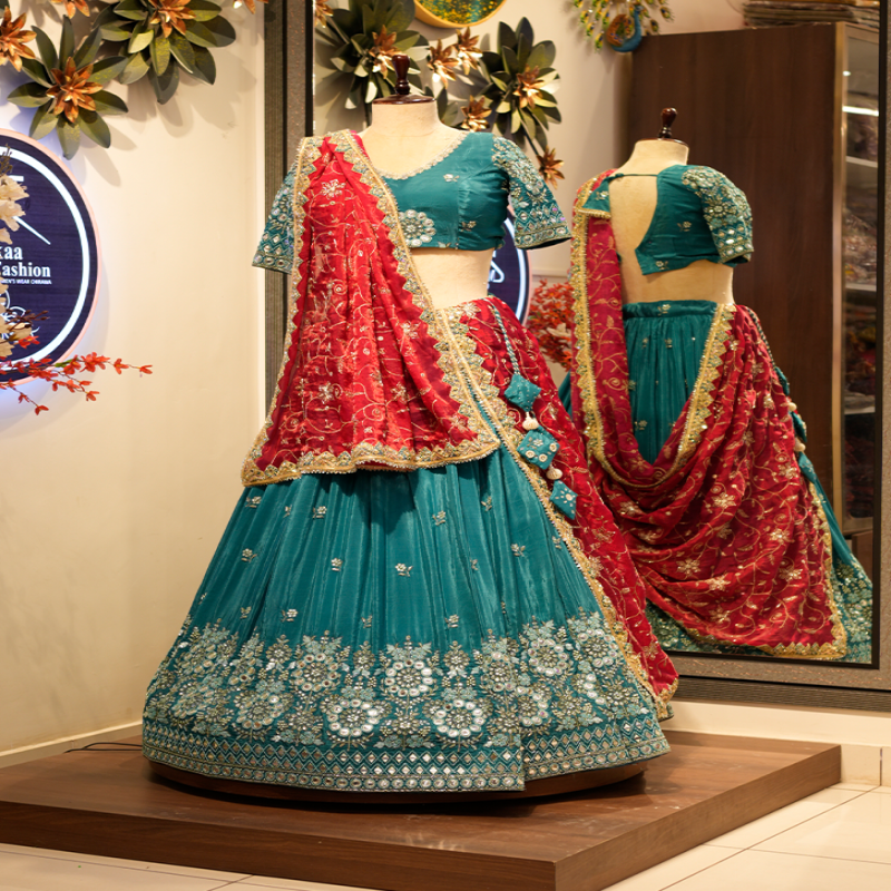 This lehenga is a vibrant and regal combination of teal blue and deep red, creating a classic yet striking festive look. The lehenga skirt is crafted from a rich teal fabric with a beautiful flow and natural sheen. Intricate embroidery in white and silver tones decorates the lower half, featuring floral and traditional motifs arranged in elegant patterns. The detailed border adds depth and grandeur, making the skirt a true statement piece.