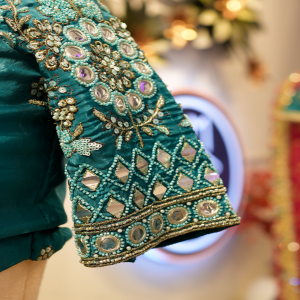 The blouse matches the skirt perfectly with its teal tone and clean, structured fit. It features delicate embroidery on the sleeves, adding a touch of charm without overwhelming the design. The back cut and sleeve detailing enhance its modern appeal while maintaining traditional grace.