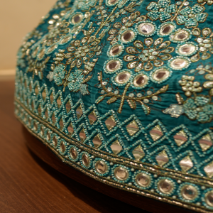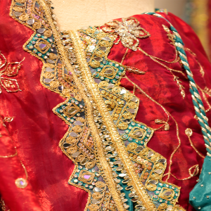 The dupatta stands out with its bold contrast—crafted in a deep red shade adorned with golden embroidered motifs and an embroidered border. Draped elegantly, it adds richness and festive vibrancy to the entire ensemble. The color contrast between the teal lehenga and red dupatta creates a visually captivating balance, giving the outfit a royal and celebratory charm.